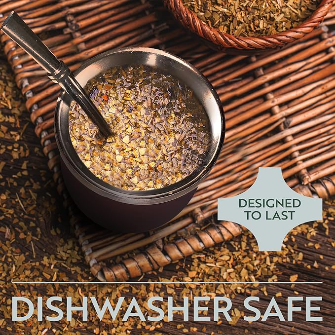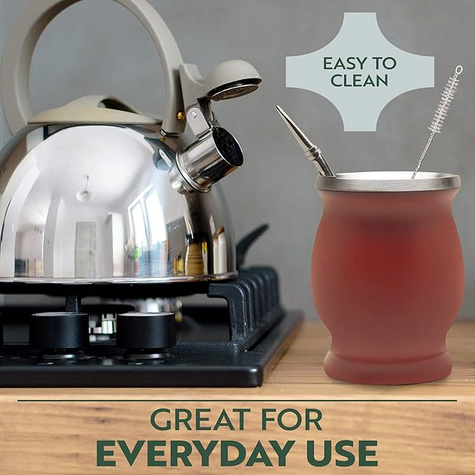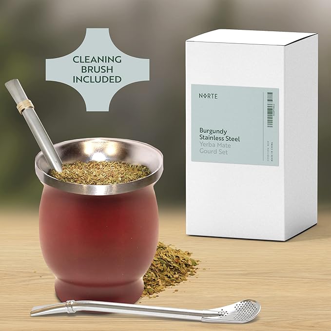 Norte Yerba Mate Cup Kit, 8-Ounces Traditional Mate Tea Cup/Gourd Set | Includes 2 Bombillas (Yerba Mate Straw) & Cleaning Brush, Stainless Steel Cup, Double-Walled, Easy to Clean | Burgundy