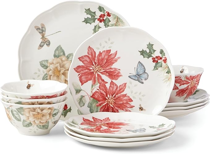 Lenox 884473 Butterfly Meadow Holiday 12-Piece Dinnerware Set, Christmas, Hosting