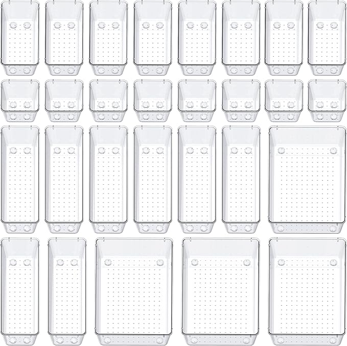 SMARTAKE 28 Piece Drawer Organizers with Non-Slip Silicone Pads, 4-Size Desk Drawer Organizer Trays Storage Tray for Makeup, Jewelries, Utensils in Bedroom Dresser, Office and Kitchen, Clear