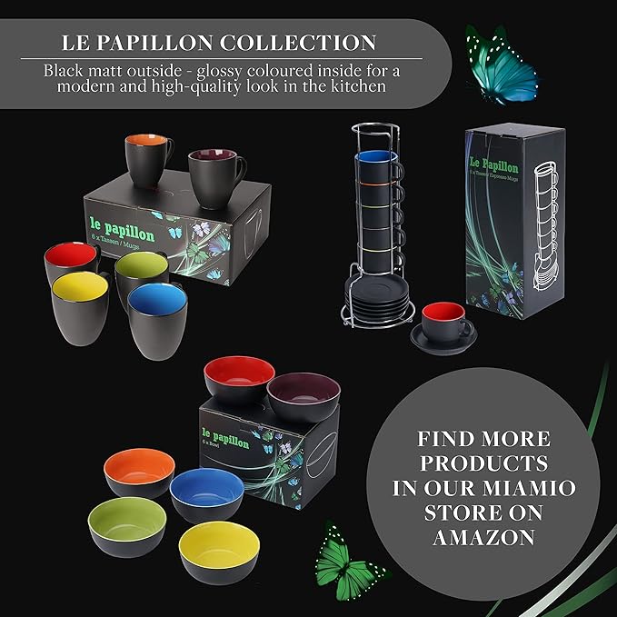 MIAMIO - Set of 6 Stoneware Coffee Mugs 12 Ounce/Cup Set - Le Papillon Collection (Black-Colourful)