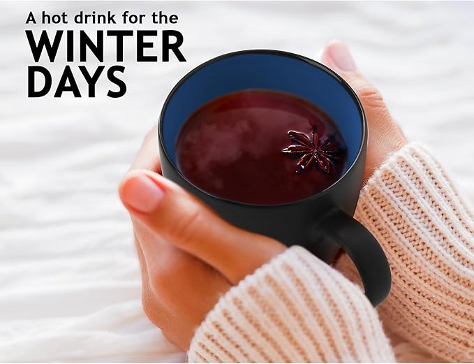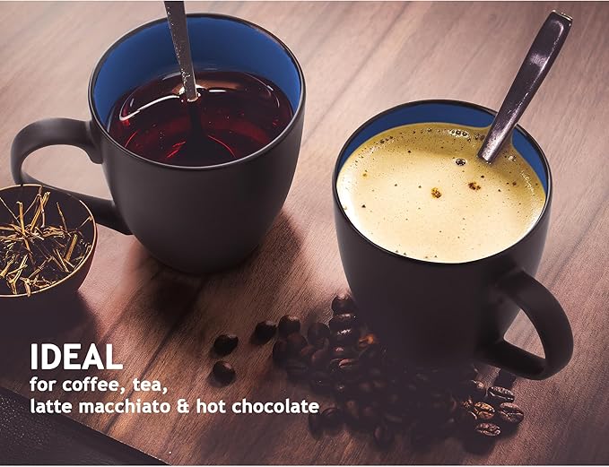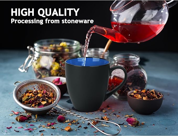 MIAMIO - Set of 6 Stoneware Coffee Mugs 12 Ounce/Cup Set - Le Papillon Collection (Black-Blue)