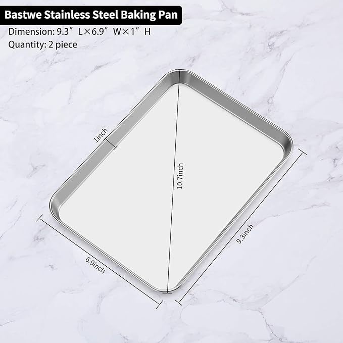 Baking Sheets 2 Pieces, Bastwe Stainless Steel Baking Pan Tray Cookie Sheet, Rectangle Size 9 X 7 X 1 inch, Healthy & Non Toxic, Rust Free & Mirror Finish, Easy Clean & Dishwasher Safe