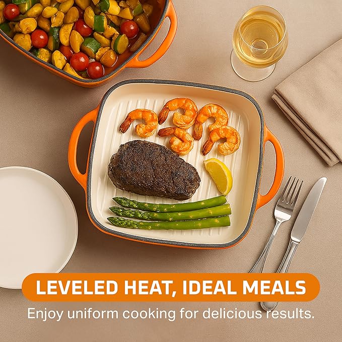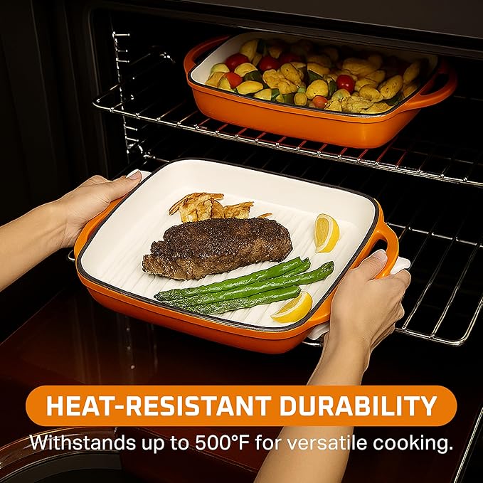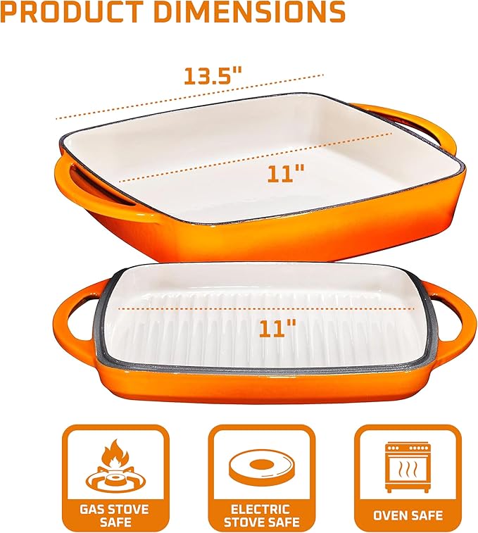 Bruntmor 11-Inch Enameled Cast Iron Cookware - 2-in-1 Square Cast Iron Casserole Dish with Lid and Dual Handles for Baking, Braising, and Roasting - Durable, Nonstick Skillet Dutch Oven, Pumpkin Spice