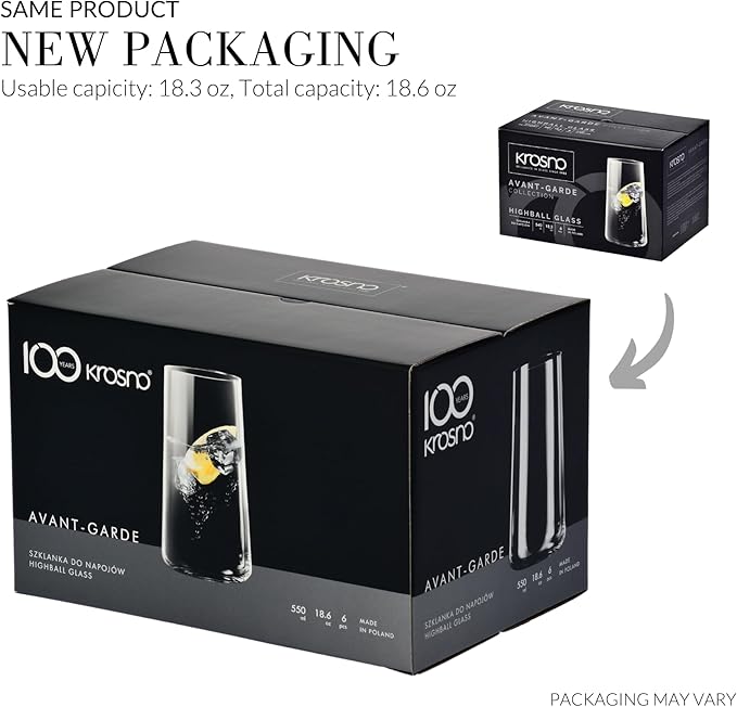 Krosno Tall Water Glasses, Set of 6, 18.3 oz, Avant-Garde Collection, Lightweight Crystal Glass, Perfect for Everyday, Dishwasher Safe, Made in Europe