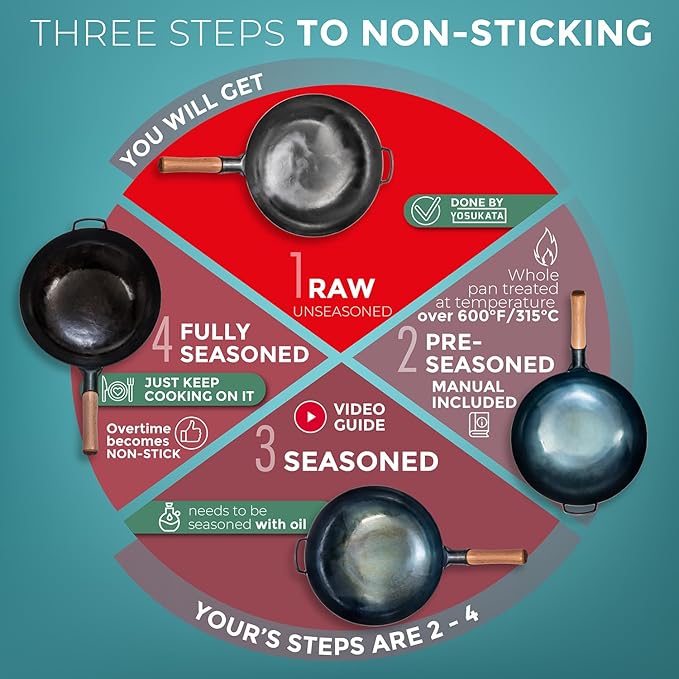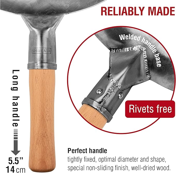 YOSUKATA 14” Round Bottom Carbon Steel Woks and Stir Fry Pans – Unseasoned Pow Wok for Stir Fry, BBQ & Camping – Hand-Hammered Traditional Japanese and Chinese Pan – Gas Stove, Open Fire Only
