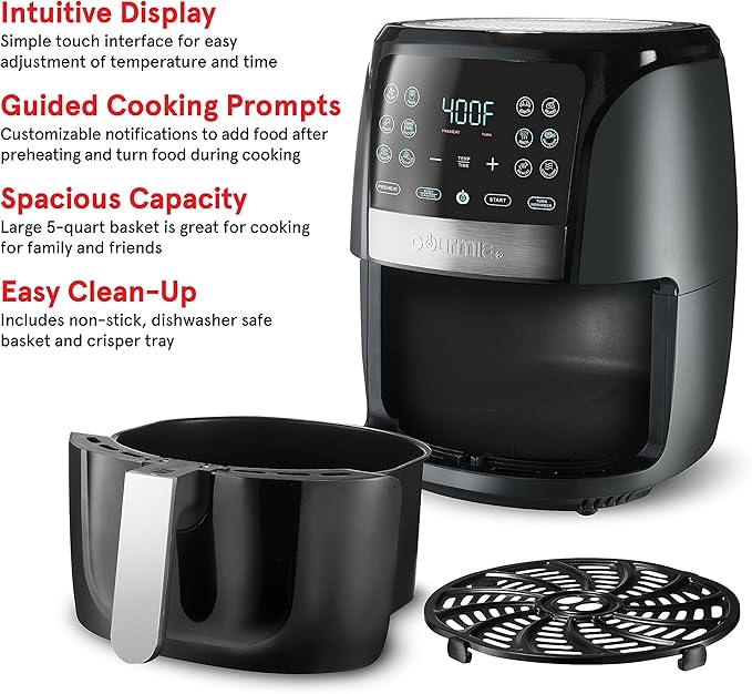 Gourmia Air Fryer Oven Digital Display 5 Quart Large AirFryer Cooker 12 Touch Cooking Presets, XL Air Fryer Basket 1500w Power Multifunction Stainless Steel FRY FORCE 360° (5 QT)