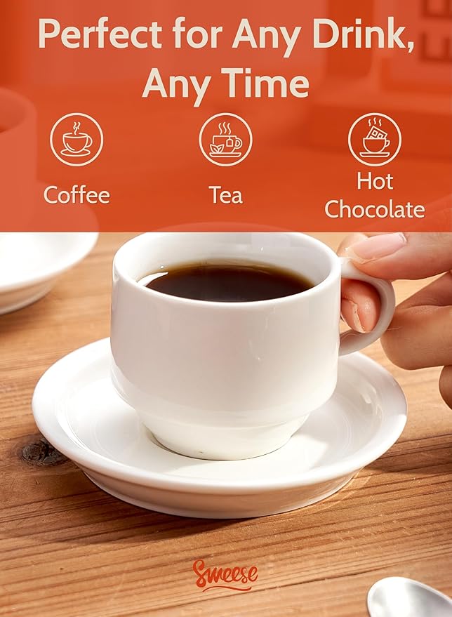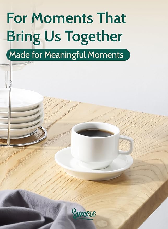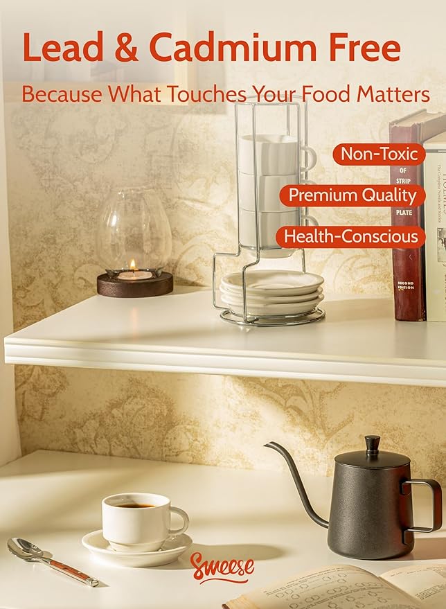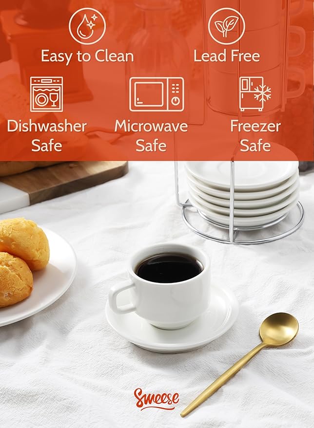 Sweese Porcelain Espresso Cups Set, 4 oz Stackable Cups with Saucers Metal Stand, Set of 4, White