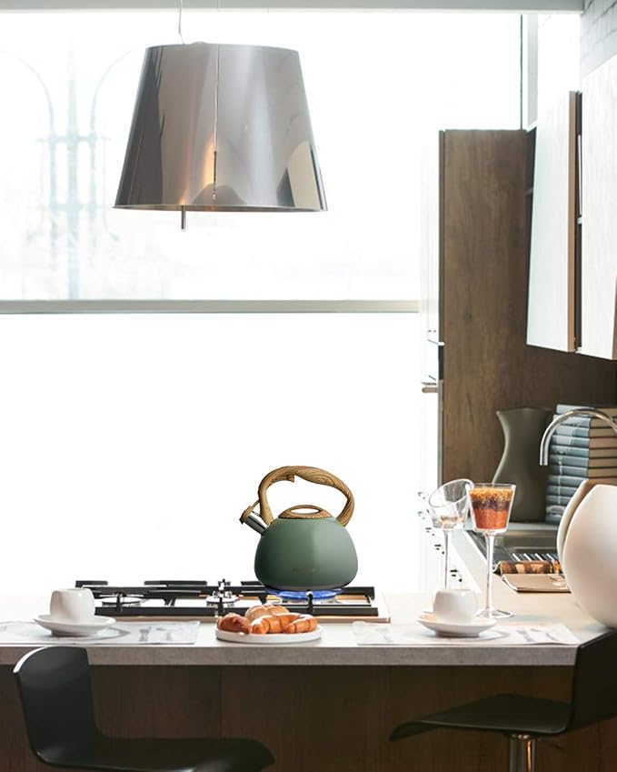 Poliviar Tea Kettle, 2.7 Quart Seaweed Green Finish with Wood Pattern Handle Loud Whistle Food Grade Stainless Steel Teapot, Anti-Hot Handle and Anti-Rust, Suitable for All Heat Sources (JX2020-SB30)