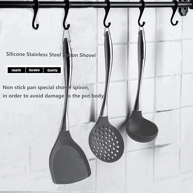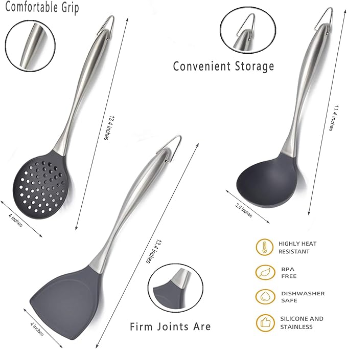 Silicone Stainless Steel Kitchen Utensils Set, 3-Pieces Flexible Silicone Head Cooking Utensil with Wok Spatula, Ladle, Slotted Spoon (Grey)