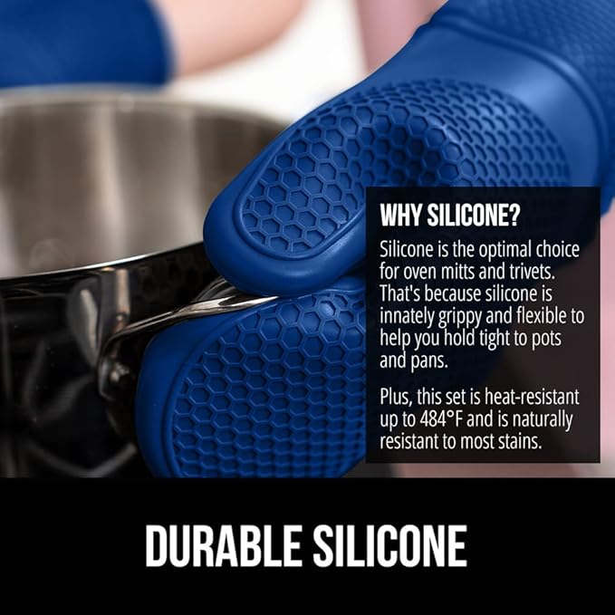 GORILLA GRIP BPA-Free Soft Silicone Oven Mitts and Pot Holders Sets of 4, Heat Resistant Waterproof Cooking Gloves, Thick Cotton Lining, Flexible Gripping for Baking Grilling, Kitchen Trivets, Blue