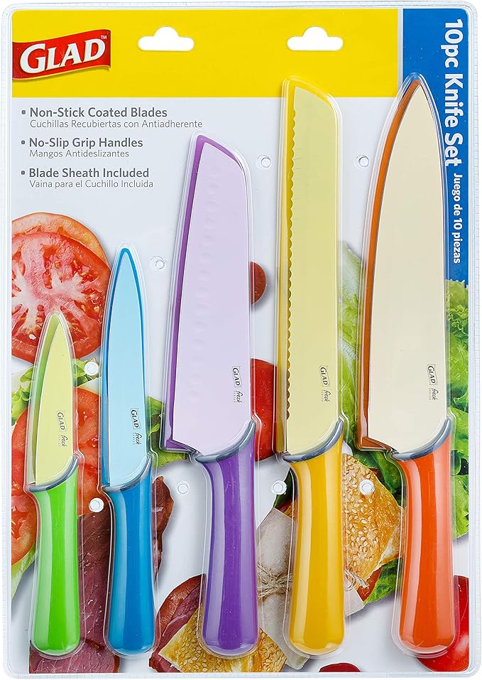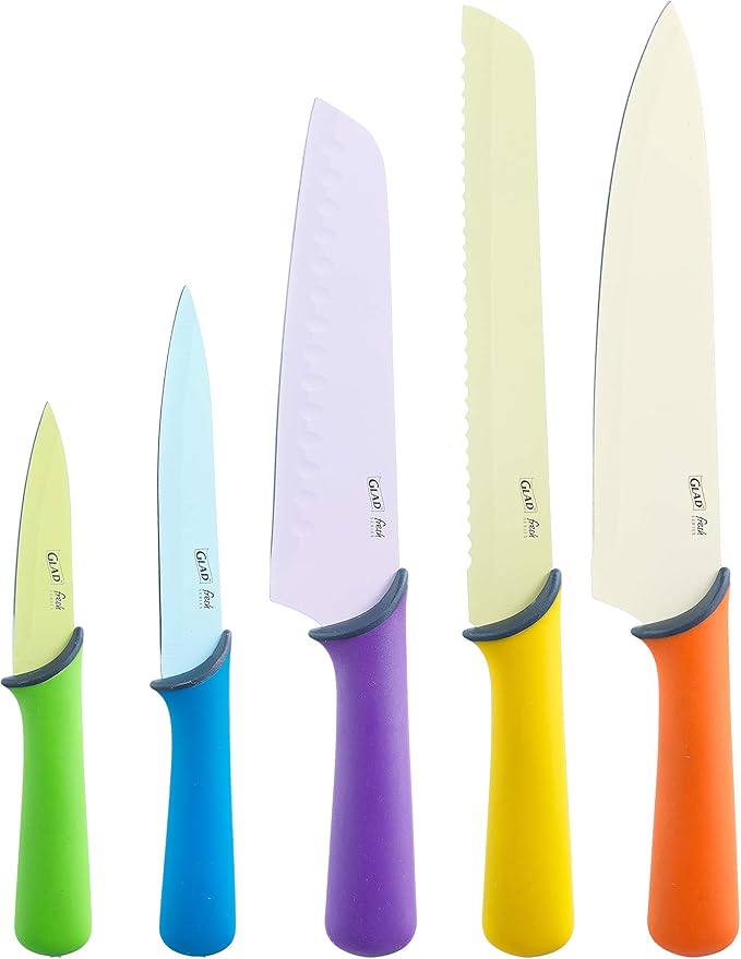 GLAD Knife Set for Kitchen – Stainless Steel Chef Knives with Sheaths | Sharp Colored Blades with Non-Slip Handles | Assorted Nonstick Cooking Essentials for Home
