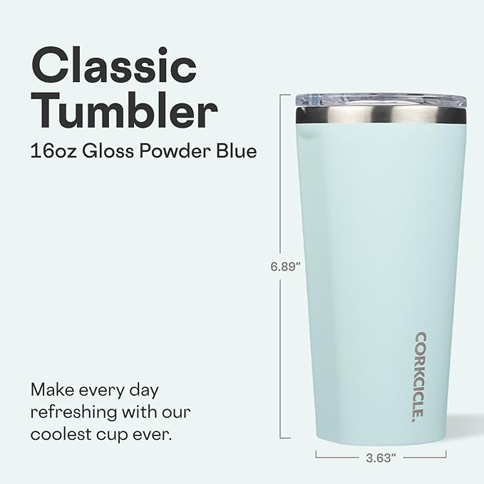 Corkcicle Classic Tumbler - Keeps Drinks Cold for 9 Hours & Hot for 3 - Triple-Insulated Stainless Steel - Holiday Tumbler Gift - 16 oz - Gloss Powder Blue