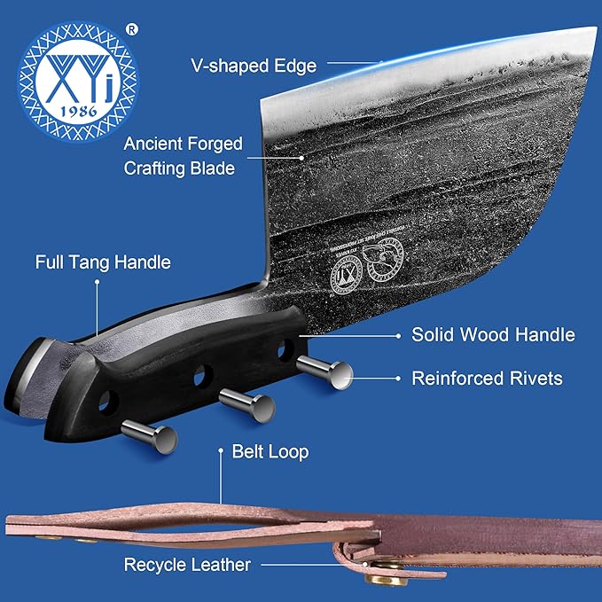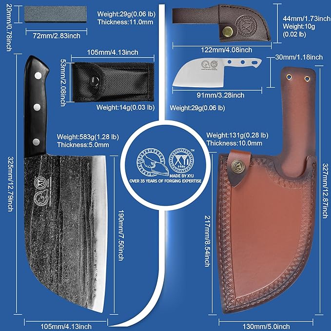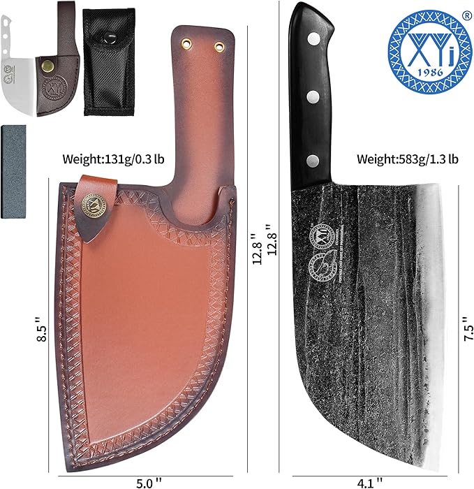 XYJ Authentic Since 1986,Outstanding Ancient Forging, 7.5 Inch Full Tang, Serbian Chefs knife,Chef Meat Cleaver,Kitchen Knives,Set with Leather Sheath,Take Carrying,Butcher