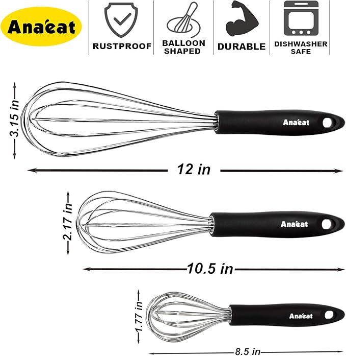 3 Packs Stainless Steel Whisk Set - Balloon Whisk, Anaeat Thick Stainless Steel Wire & Strong Handles, Egg Beater for Cooking, Blending, Whisking, Beating and Stirring (8.5"+10.5"+12")