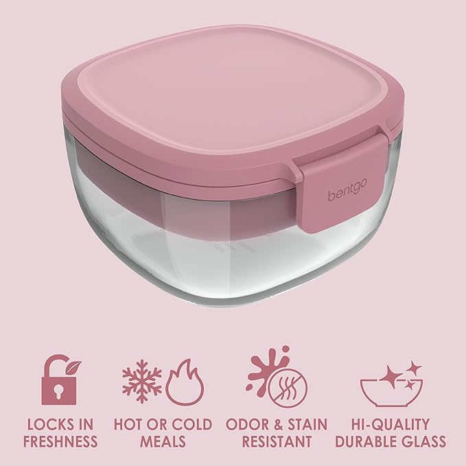 Bentgo Glass All-in-One Salad Container - Large 61-oz Salad Bowl with Lid, 4-Compartment Bento-Style Tray, 3-oz Sauce Container, and Reusable Fork - Dishwasher, Microwave, and Oven Safe (Rose)