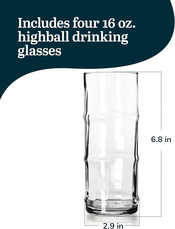 Libbey Tiki Bamboo Highball Drinking Glasses,Iconic 16 Oz Tall Cocktail Glasses Set of 4,Modern Highball Cocktail Glasses