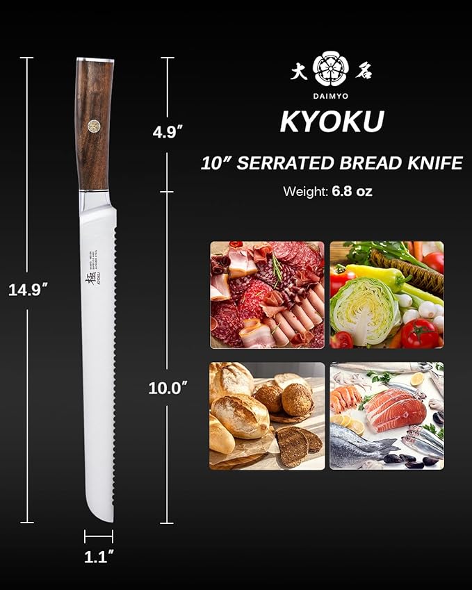 About This 10" BREAD KNIFE: This serrated knife is part of Kyoku's premier Daimyo series, manufactured with modern technology and... Read more