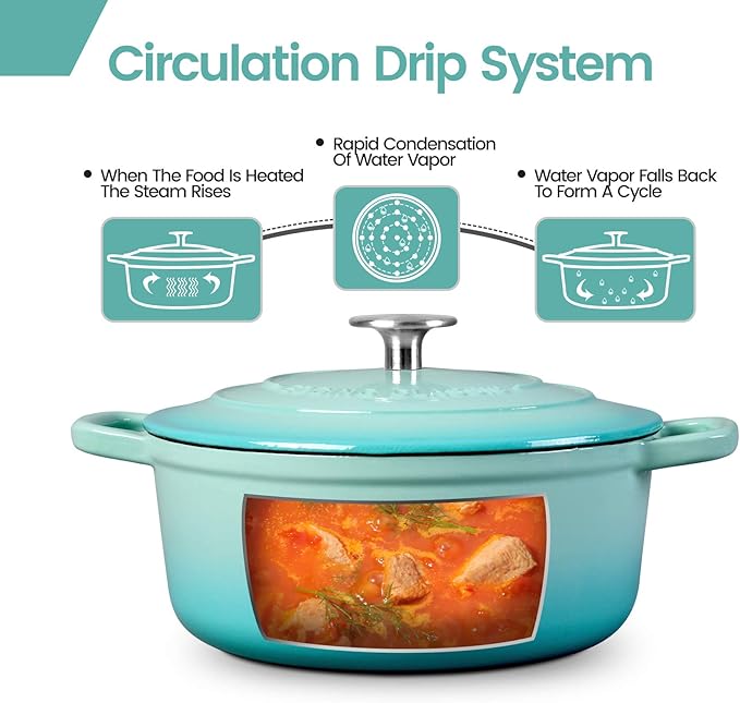 Enameled Cast Iron Covered 5.5 Quart Dutch Oven with Dual Handle for Bread Baking, Dutch Ovens with Lid, Peacock Blue