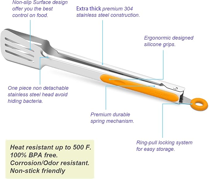 Premium 304 Stainless Steel Barbecue Turners, Heavy Duty Non-Stick BBQ Cooking Kitchen Tongs, 9" and 12" Orange