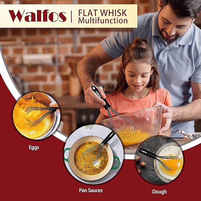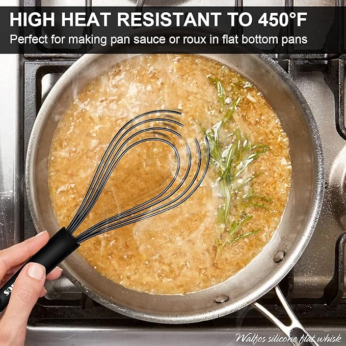 Walfos Silicone Flat Whisk,11inch Flat Whisk Non Scratch Coated Flat Whisks for Cooking.Great for Ceramic Coated pans and Wider shallower pots.Black