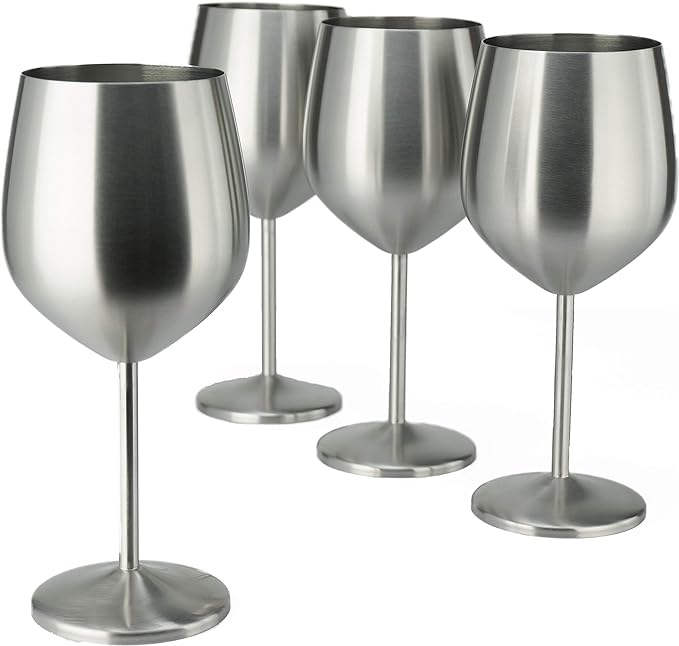 PG Set of 4 Stainless Steel Wine Glass - 18.5oz Silver Brush Finished Wine Glasses - Unbreakable Wine Glasses - Stem Metal Wine Goblets