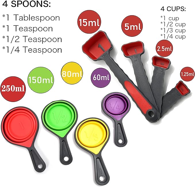 Collapsible Silicone Soft Measuring Cups and Measuring Spoons,8 pieces Portable Food Grade Silicone Measurement Cup for Liquid & Dry Measuring Baking & Travel Measuring Cup,space saver (Purple)