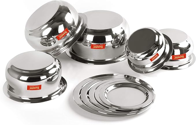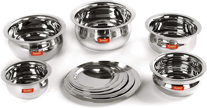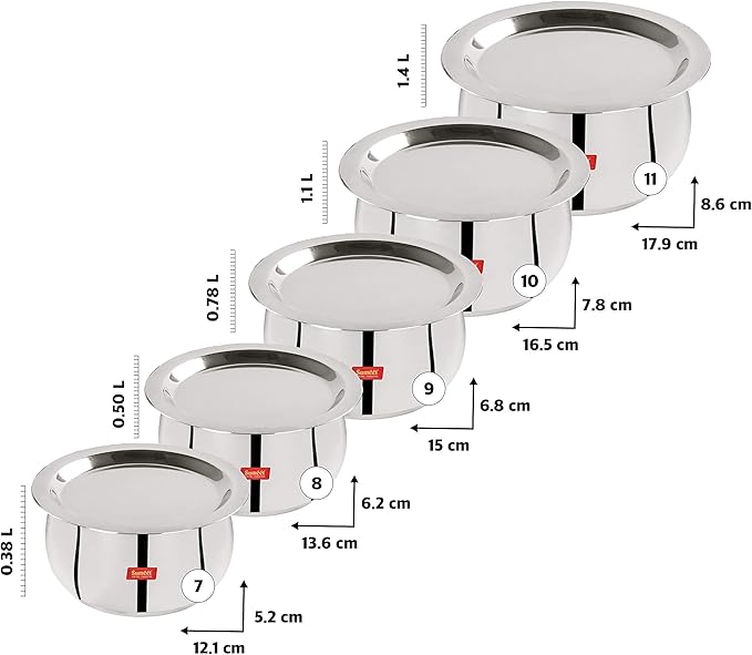 Sumeet Stainless Steel Belly Shape 5 Pc Tope/Cookware/Pot Set with Lid 380ML, 500ML, 780ML, 1.1Ltr, 1.4Ltr, (Silver)