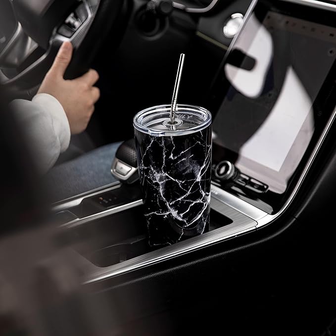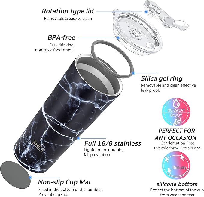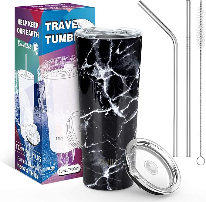 THILY Stainless Steel Vacuum Insulated Tumbler Travel Mug 26 oz Coffee Cup with 2 Lids and Straws, Splash Proof, Keep Ice Drinks Cold, Black Marble