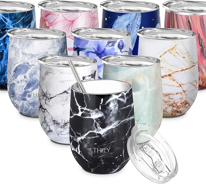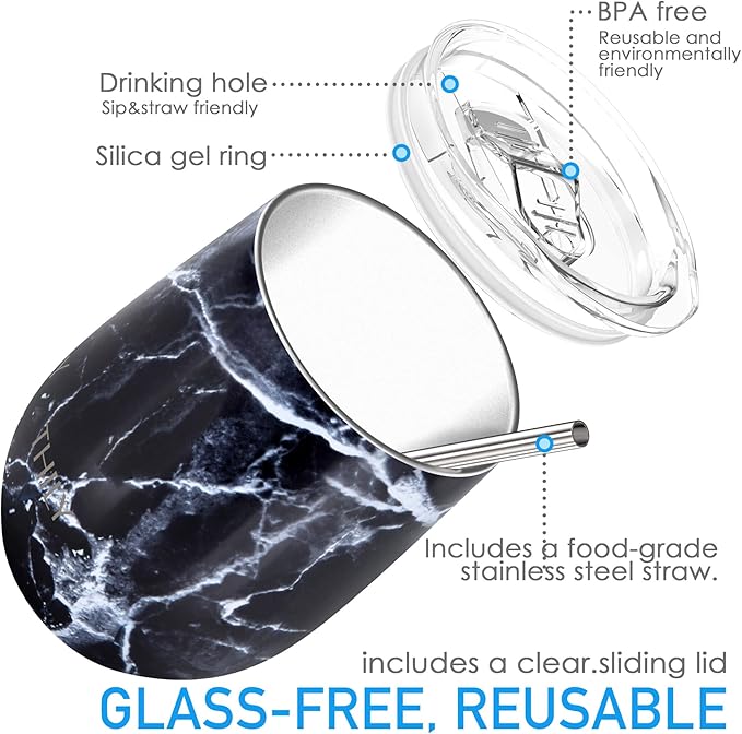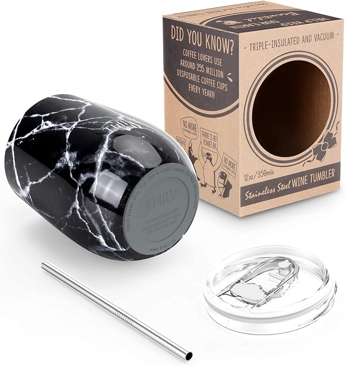 THILY Wine Tumbler Stainless Steel Insulated Stemless Wine Glass with Lid and Straw, Travel Cup Keep Cold for Coffee, Cocktails, Black Marble