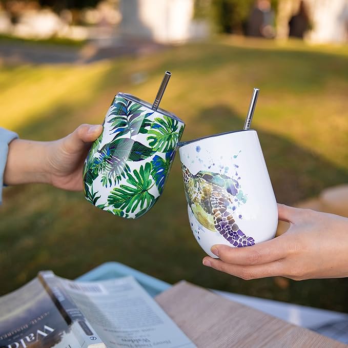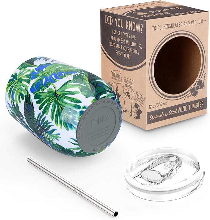 THILY Stemless Wine Tumbler Vacuum Insulated 12 oz Triple-Insulated Stainless Steel Wine Glass with Lid, Straw, Keep Cold for Coffee, Cocktails, Green Plants