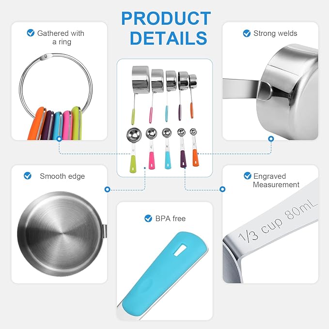 Measuring Cups and Spoons Set Stainless Steel 10 Piece for Cooking and Baking (5 Cups + 5 Spoons, Colorful Handles)