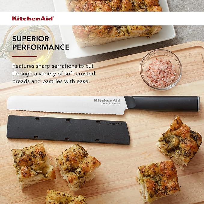 KitchenAid Classic Serrated Bread Knife with Custom-Fit Blade Cover, 8-inch, Sharp Kitchen Knife, High-Carbon Japanese Stainless Steel Blade, Black