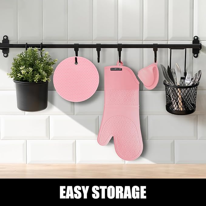 Rorecay 6pcs Oven Mitts and Pot Holders Sets for Kitchen, Extra Long Non-Slip Silicone Oven Gloves Heat Resistant 500 Degrees Potholders Hot Pads for Baking Cooking, Quilted Liner, Pink
