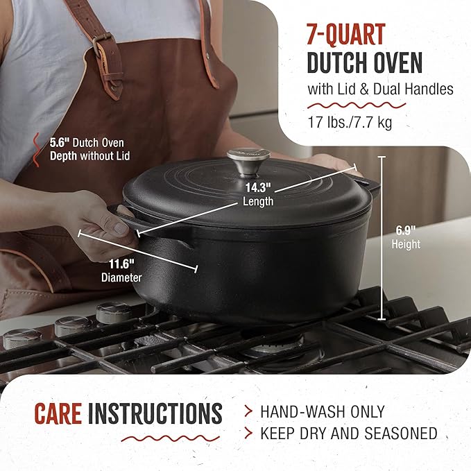 Victoria Cast Iron Large Dutch Oven with Lid and Dual Handles. 7 Quart Pot Seasoned with 100% Kosher Certified Non-GMO Flaxseed Oil