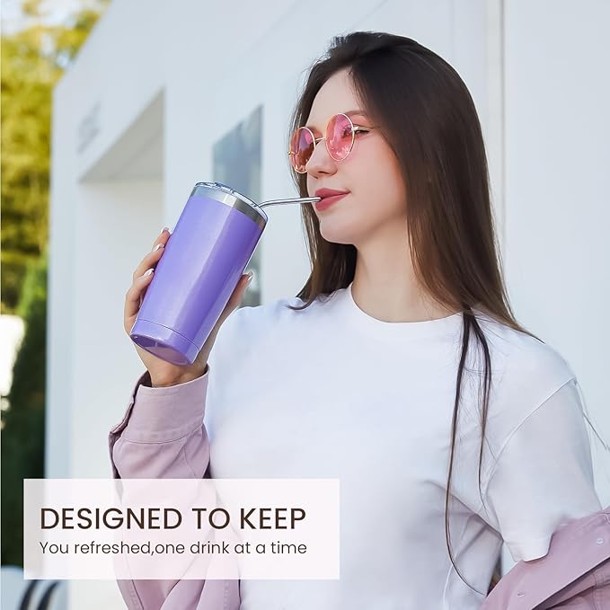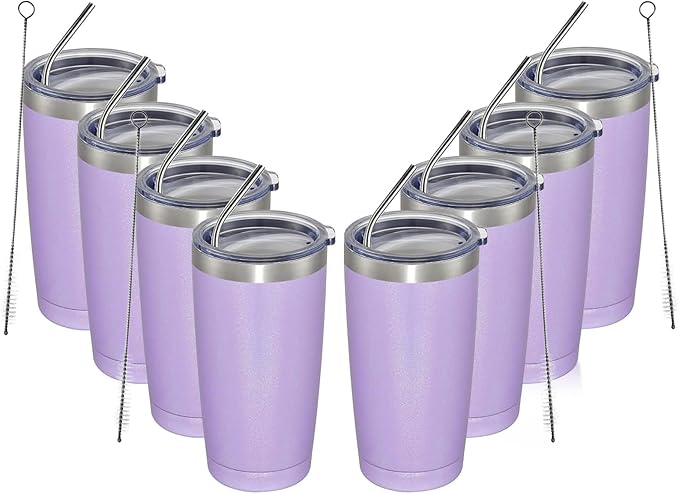 MEWAY 20oz Tumbler 8 Pack Double Wall Vacuum Insulated Travel Glitter Mug Bulk, Stainless Steel Tumblers with Lid and Straw, Powder Coated Coffee Cups for Woman(Rainbow Purple,Set of 8)