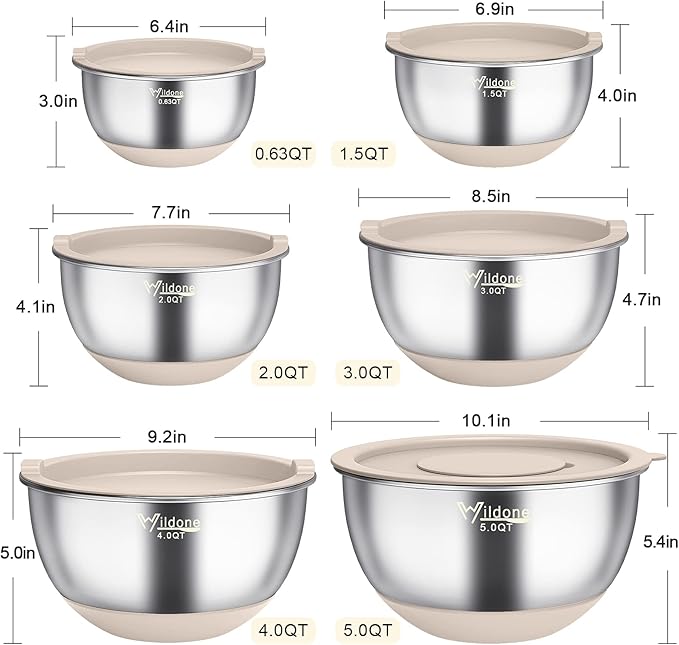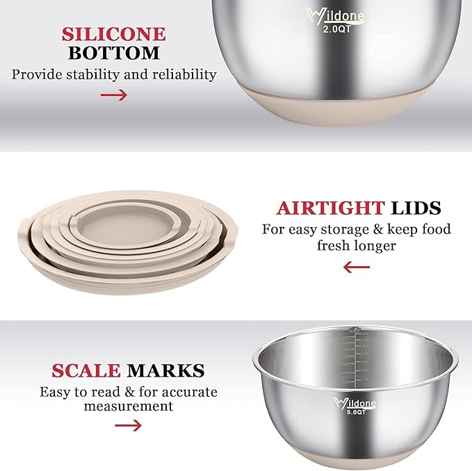 Wildone Mixing Bowls with Airtight Lids, 22 PCS Stainless Steel Nesting Bowls, with 3 Grater Attachments, Scale Marks & Non-Slip Bottom, Size 5, 4, 3, 2,1.5, 0.63QT, Ideal for Mixing & Prepping