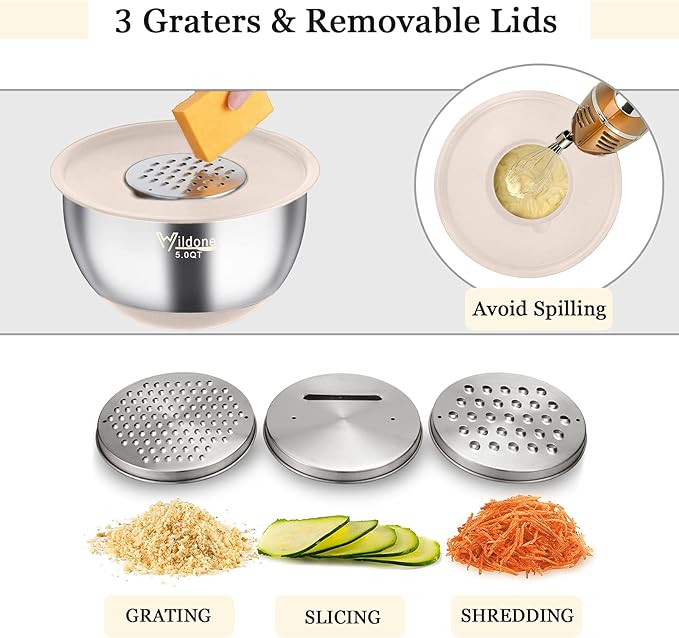 • Airtight Lids & Multiple Inserts: Airtight Lids that fit snugly to keep an airtight seal and keep food fresh, so this set can be used as dry storage bowls with lids on. Our bowl set also comes with 3 different grater inserts (Slicing, Grating, Shredding) that fit snugly into the lid of the largest bowl, it’s more convenient for you and your family