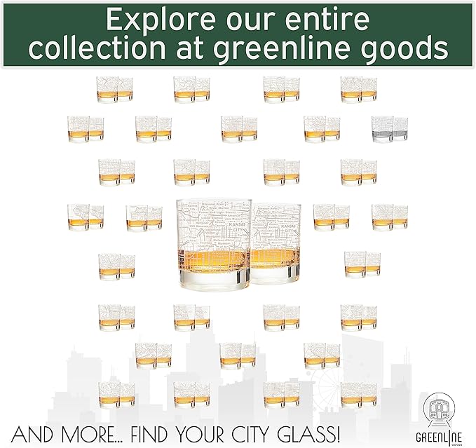 Greenline Goods Whiskey Glasses - 10 Oz Tumbler Set for Kansas lovers, Etched with Kansas City Map Old Fashioned Rocks Glass - Set of 2