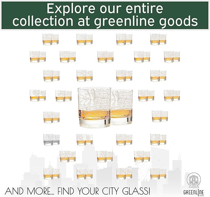 Greenline Goods Whiskey Glasses - 10 Oz Tumbler Set for Cincinnati lovers, Etched with Cincinnati City Map Old Fashioned Rocks Glass - Set of 2