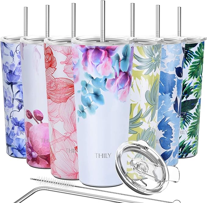 THILY Stainless Steel Vacuum Insulated Tumbler Travel Mug 26 oz Coffee Cup with 2 Lids and Straws, Splash Proof, Keep Ice Drinks Cold, Pink Lilies