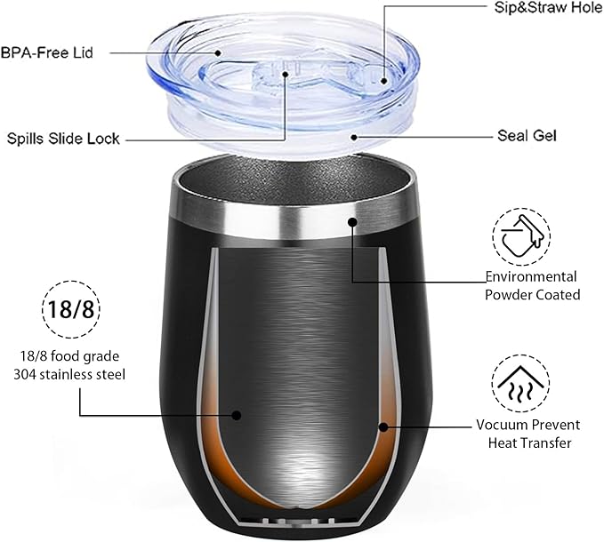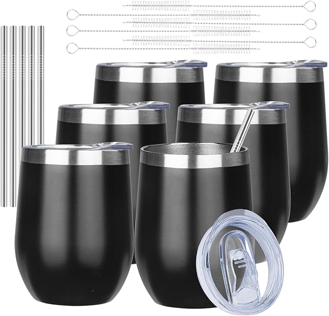MEZMUT 12 Oz Insulated Wine Tumbler with Lid Double Wall Vacuum Stainless Steel Wine Glass Coffee Mug Insulated Tumbler Cup for Champaign, Cocktail, Beer (Black, 6 Pack)