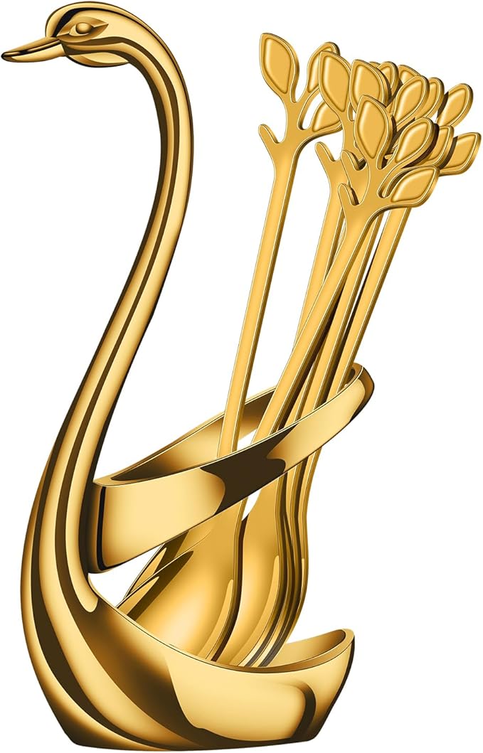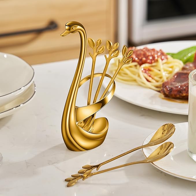 AnSaw Gold Small Coffee Spoon Holder Set,Swan Base With 10 Pcs Demitasse Espresso Spoons Set,4.7" Mini Leaf Dessert Spoon,Stainless Steel Tea Spoons