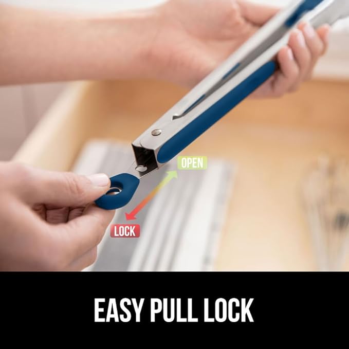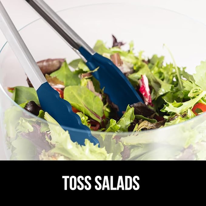GORILLA GRIP Stainless Steel Heat Resistant Kitchen Tongs for Cooking, 9 + 12 Inch, Set of 2 BBQ Tong, Non Scratch Silicone Tip for Pan, Strong Grip, Grab Food, Toss Salad, Air Fryer, Pull Lock, Blue