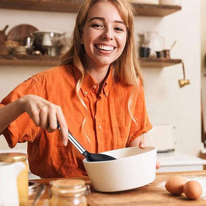 Pack of 4 Large Silicone Cooking Spatulas and Spoons, Slotted and Solid Stainless Steel Cooking Utensils Set, Non-stick Heat Resistant Kitchen for Baking, Fried, Stir-Fry, Mixing, Serving (Black)
