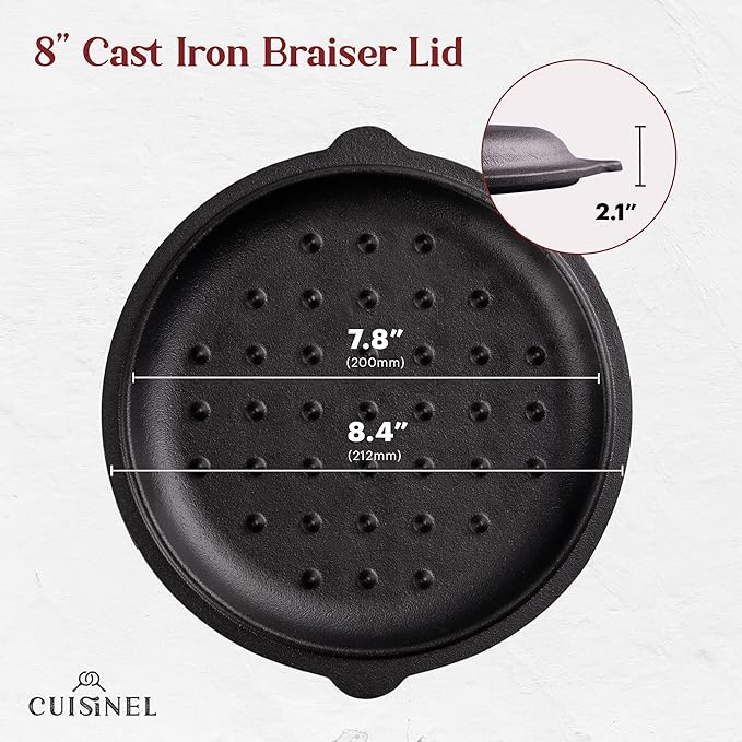 Cuisinel Cast Iron Lid - Fits 8"-Inch / 20.32cm Lodge Skillet, Frying Pans or Braiser + Silicone Handle Holder + Care Guide - Pre-Seasoned Replacement Cover - Indoor/Outdoor, Oven, Open Fire, BBQ Safe