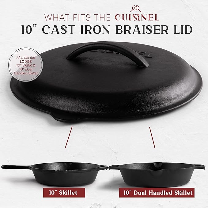 Cuisinel Cast Iron Lid - Fits 10"-Inch Lodge Skillet Frying Pans or Braiser + Silicone Handle Holder + Care Guide - 25.4-cm Pre-Seasoned Universal Replacement Cover - Indoor/Outdoor, Fire, BBQ Safe