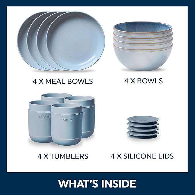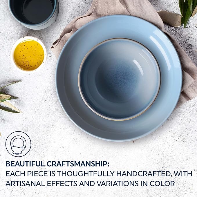 Corelle Stoneware Dinnerware Set, Handmade Reactive & Solid Glazed Ceramic Plates and Bowls, Modern Rustic Style Round Dishes, Service for 4, Nordic Blue 16 PIECE SET
