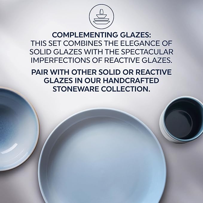 About This 16-PIECE SET: Set includes (4) 10-1/2-inch dinner plates (reactive glaze), (4) 8-1/2-inch meal bowls (solid glaze), 21-oz bowls... Read more