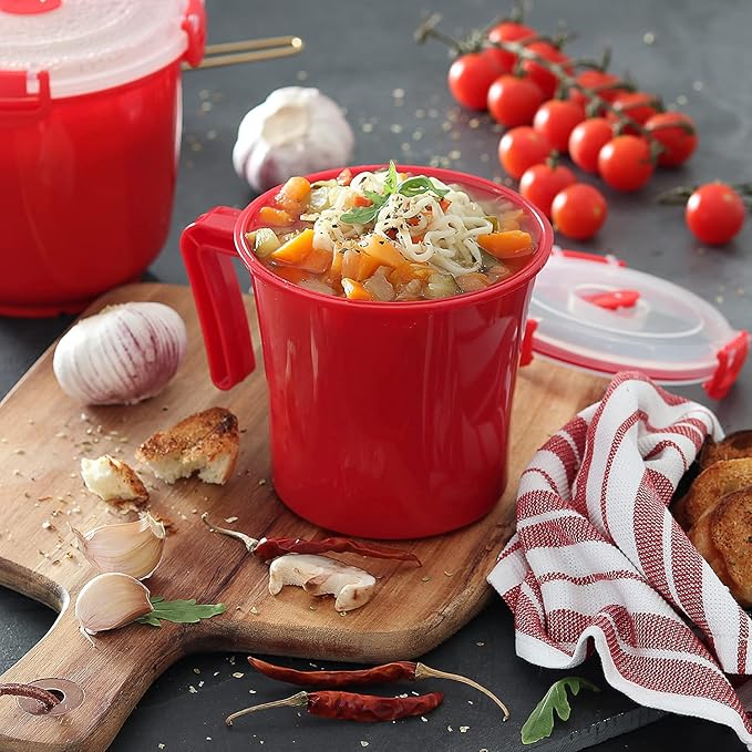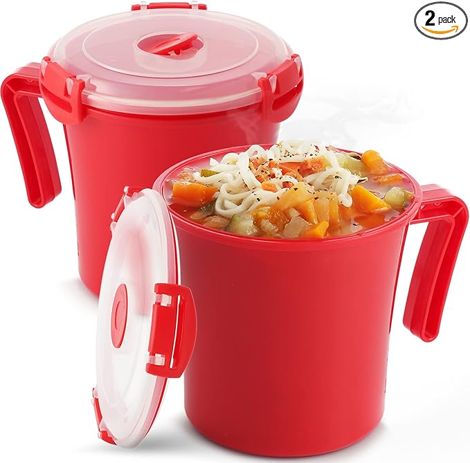 Tafura 22oz Microwave Soup Mugs with Handles, 2 Pack - Red Mug with Clear Lid