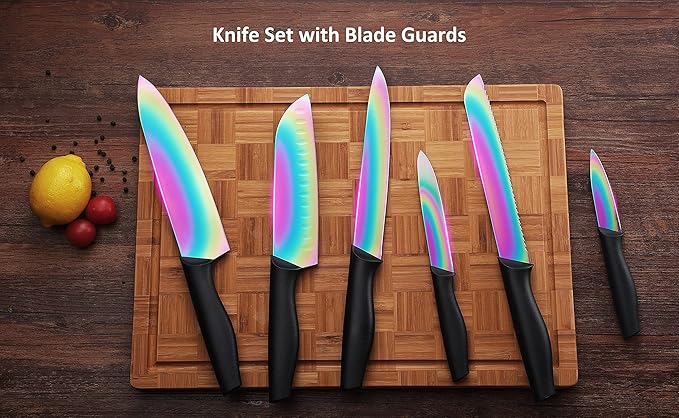 Marco Almond Kitchen Knife Set, KYA36 12-Piece Rainbow Color Stainless Steel Chef Boxed Knives Set for Kitchen with Covers, 6 Knives with 6 Blade Guards, Black